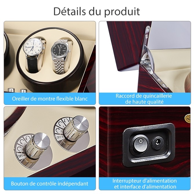 Le remontoir de montre est alimenté par un adaptateur secteur 100-240v (inclus). Non seulement vous pouvez utiliser la batterie(non incluse) pour continuer à fonctionner, nous vous fournirons également l'adaptateur de batterie correspondant.Emballage sécuritaire