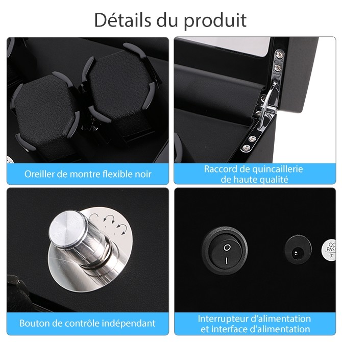 Matériau : boîte en bois/oreiller en cuir/panneau acrylique Couleur : Noir Contenu de l'emballage : 1 remontoir de montre, 1 adaptateur, 1 manuel d'utilisation, 1 chiffon pour essuyerVeuillez noter :